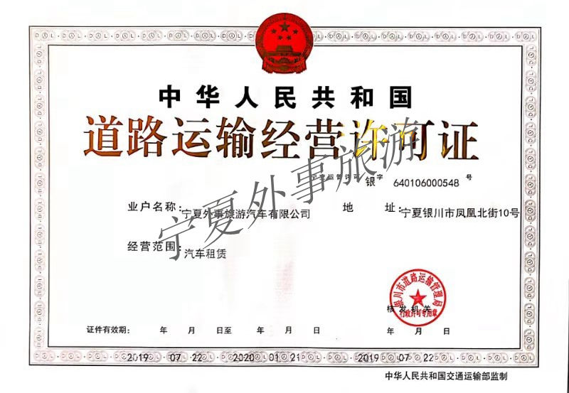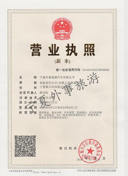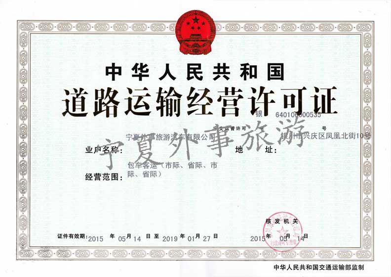 公司具备正规省际、市际包车客运资质,是宁夏第一家涉外旅游接待及旅游包车客运企业。